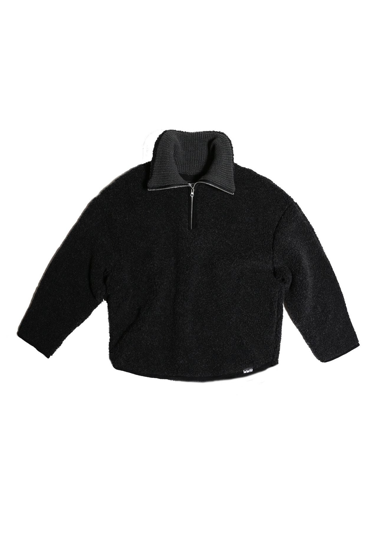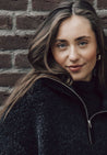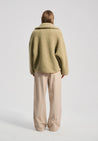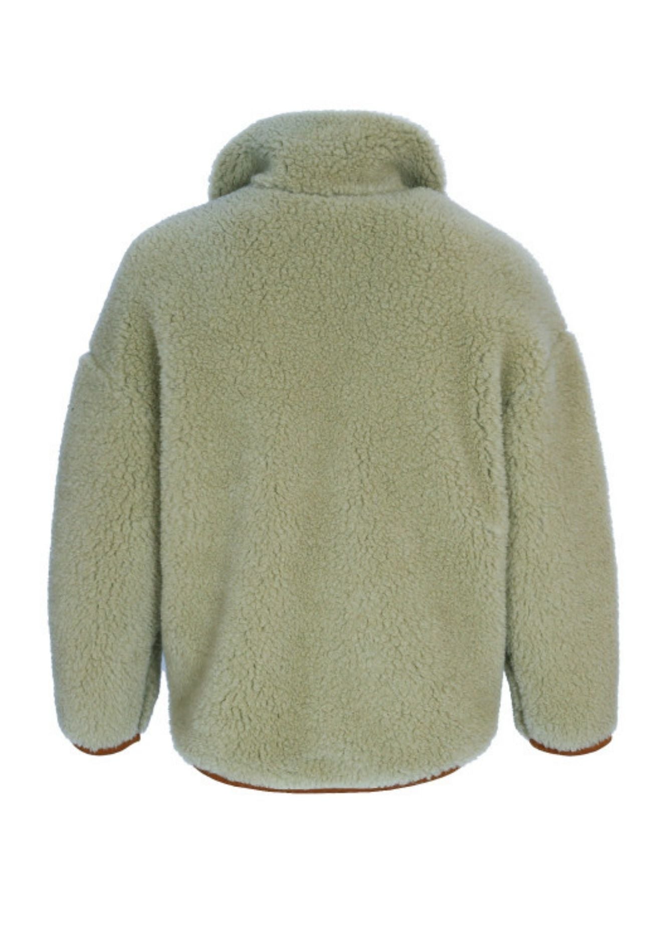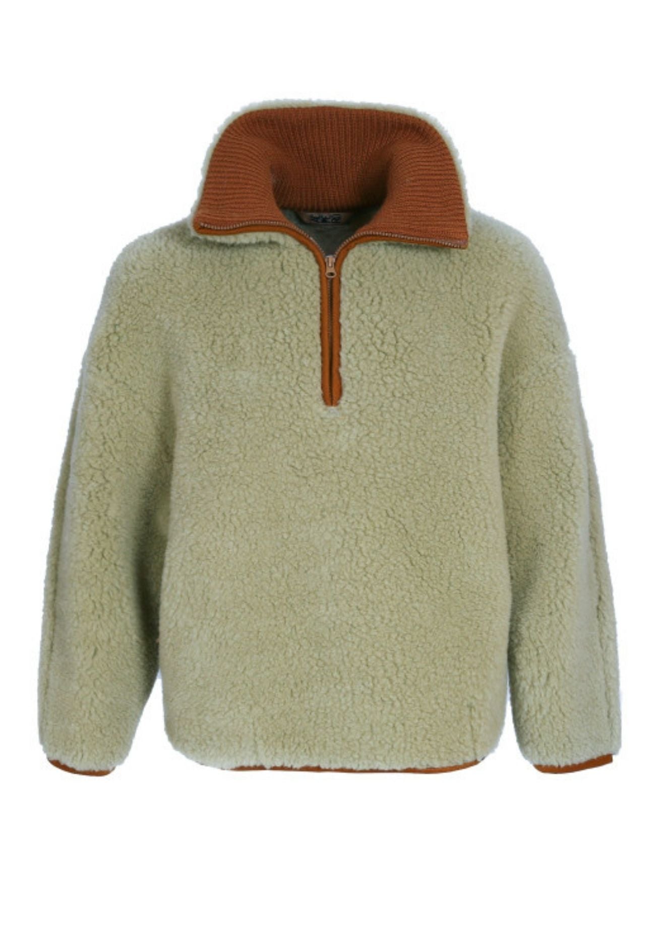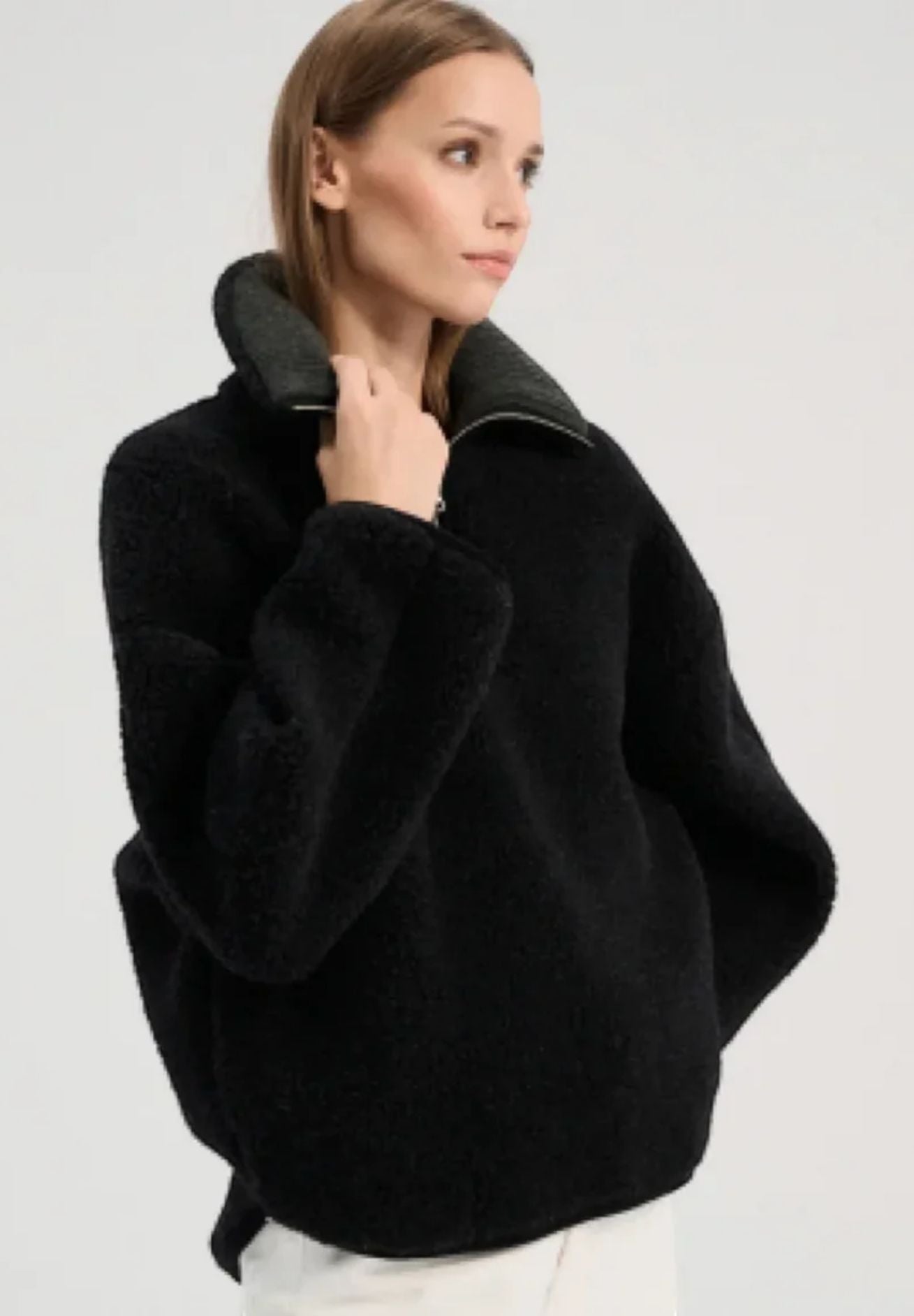 Woll-Fleece-Sweater im Oversize-Schnitt von Alwero aus weicher BIO Merinowolle - ganz weich und angenehm zu tragen. Mit hohem, geripptem Baumwollkragen auf der Innenseite und praktischem Reißverschluss vorne für optimalen Komfort. Perfekt für alle Outdooraktivitäten im Herbst und auch super für innen im Winter.