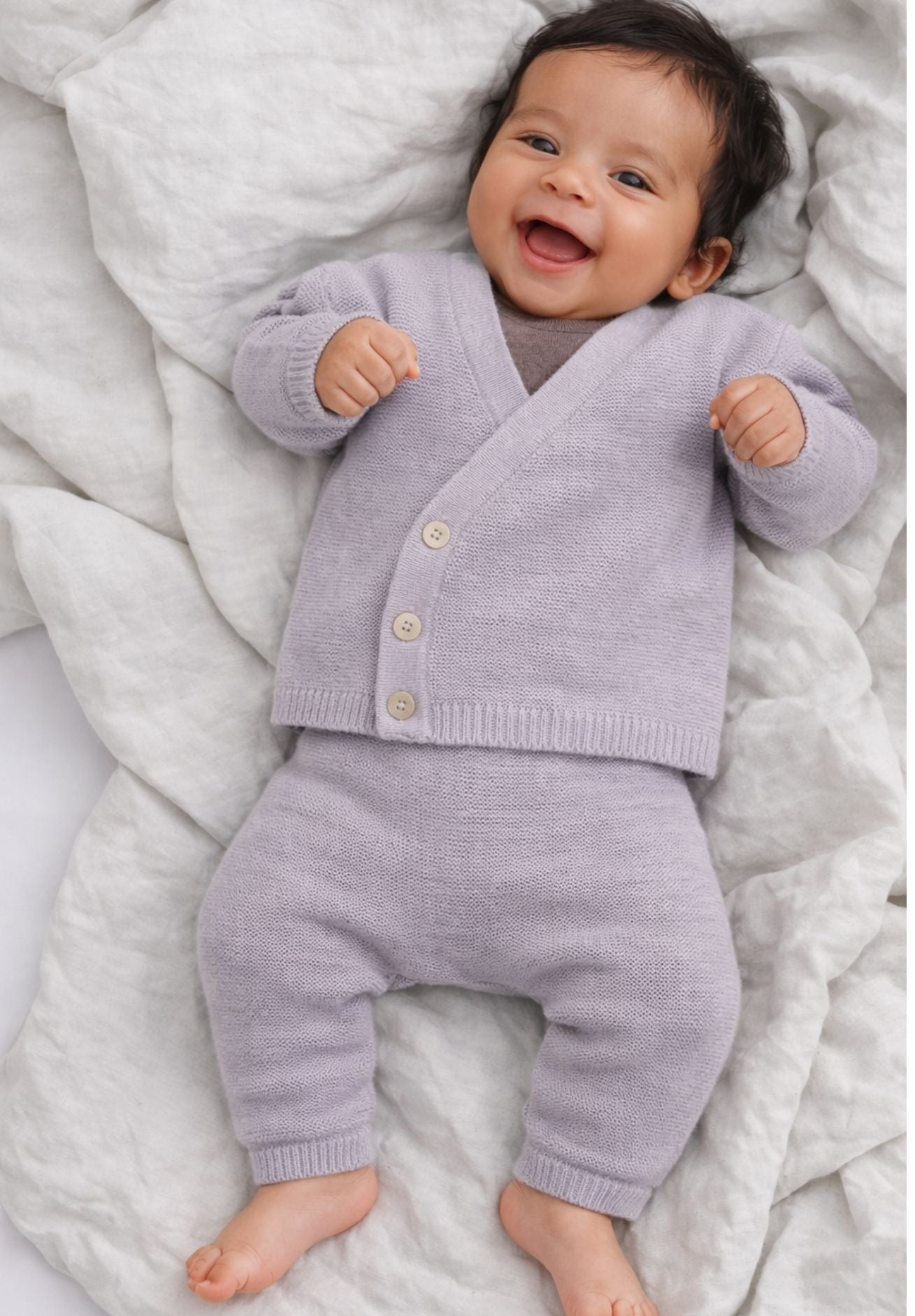 Passend dazu gibt es die wunderschönen Strick Kimonos in den gleichen zarten pure Tönen. Mit einem Wolle/Seide oder Merinobody darunter ein tolles Erstlingsoutfit.