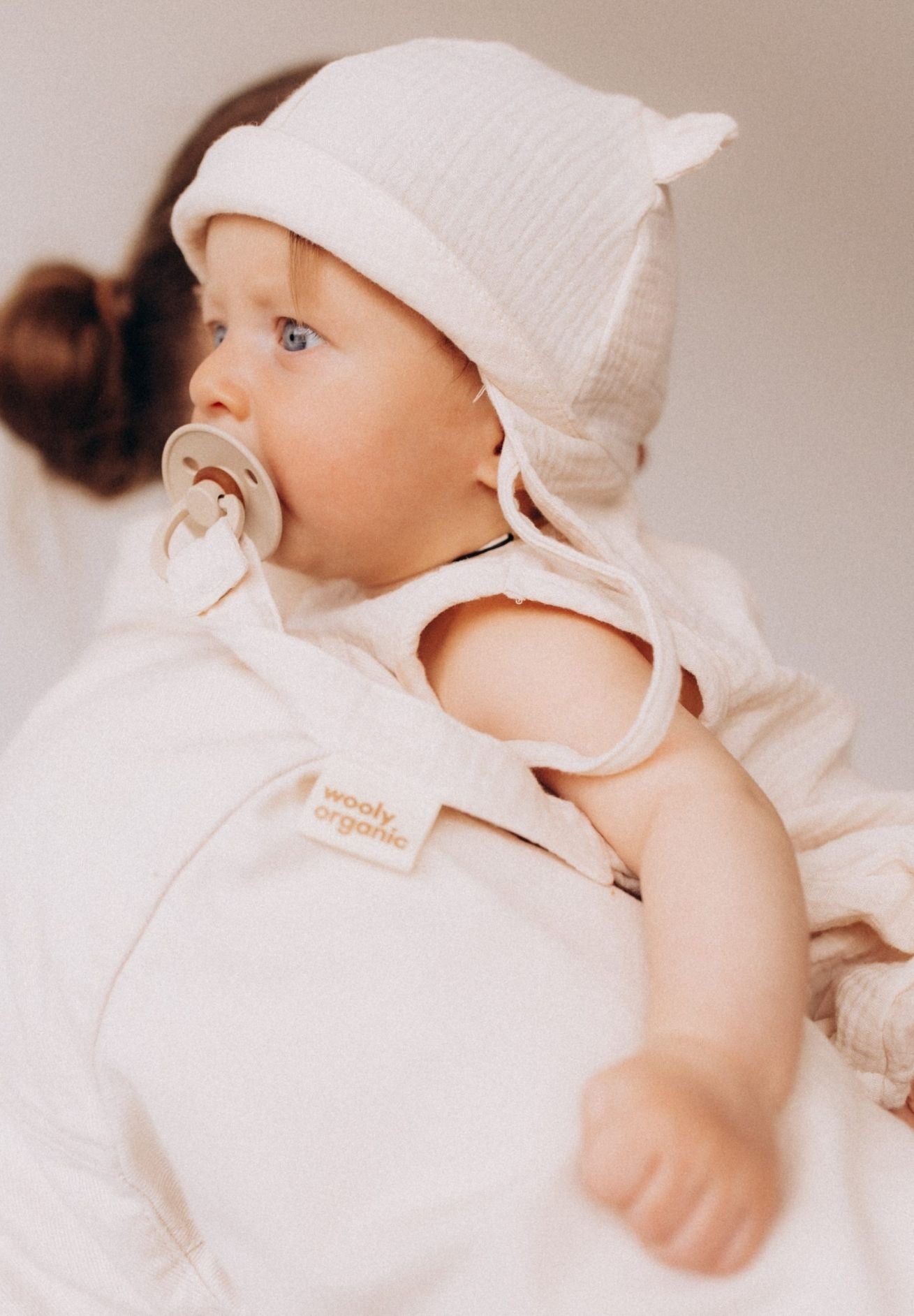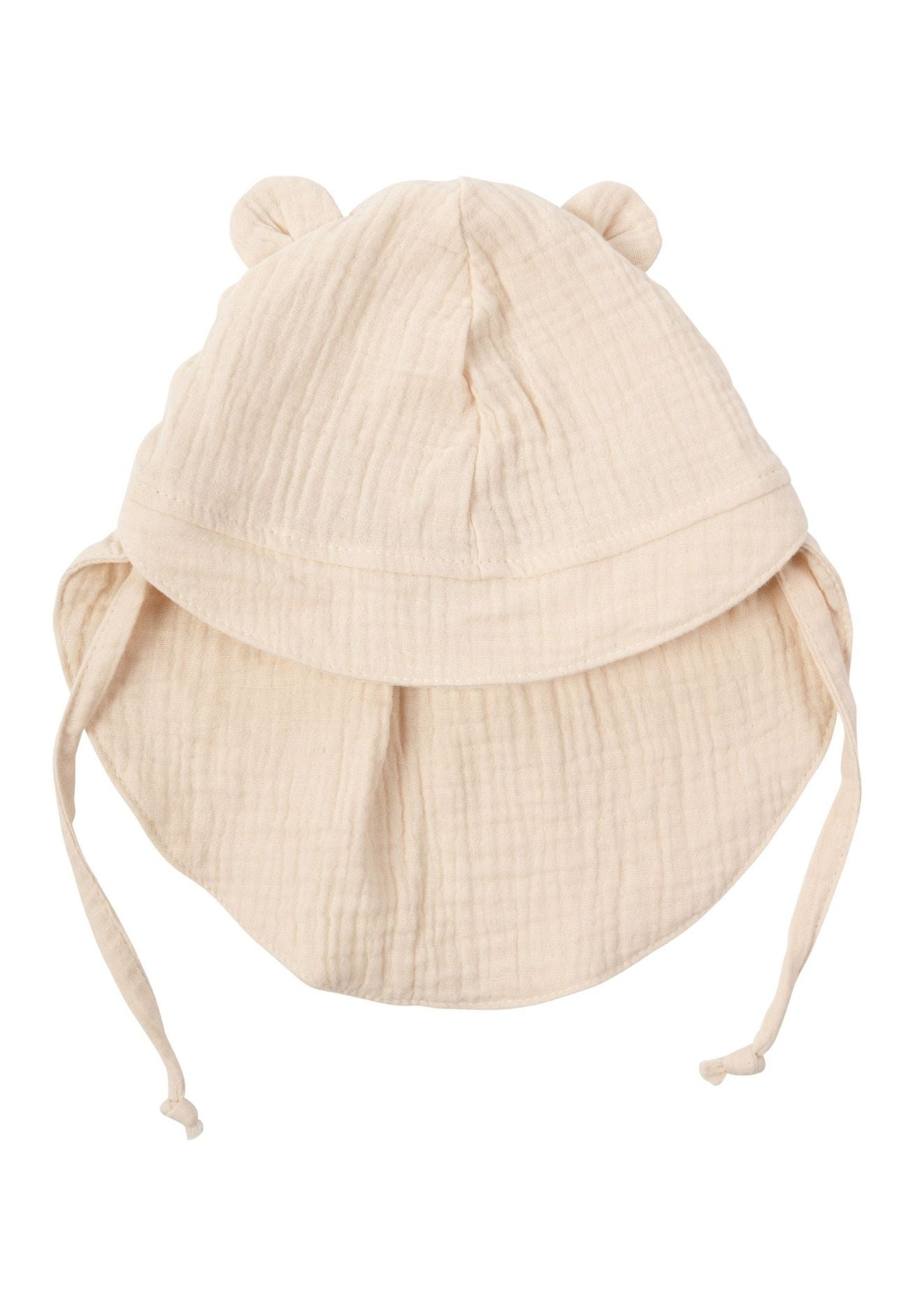 Zuckersüßer weicher Musselinsonnenhut aus Bio Musselinstoff (GOTS zertifiziert) mit süßen Ohren und Nackenschutz - perfekt für Babys in der Trage. Perfekt für das Frühjahr und Sommer. Bio Musselin kann Feuchtigkeit super aufnehmen, so dass dein Baby nicht schwitzt und ist super soft und luftig.