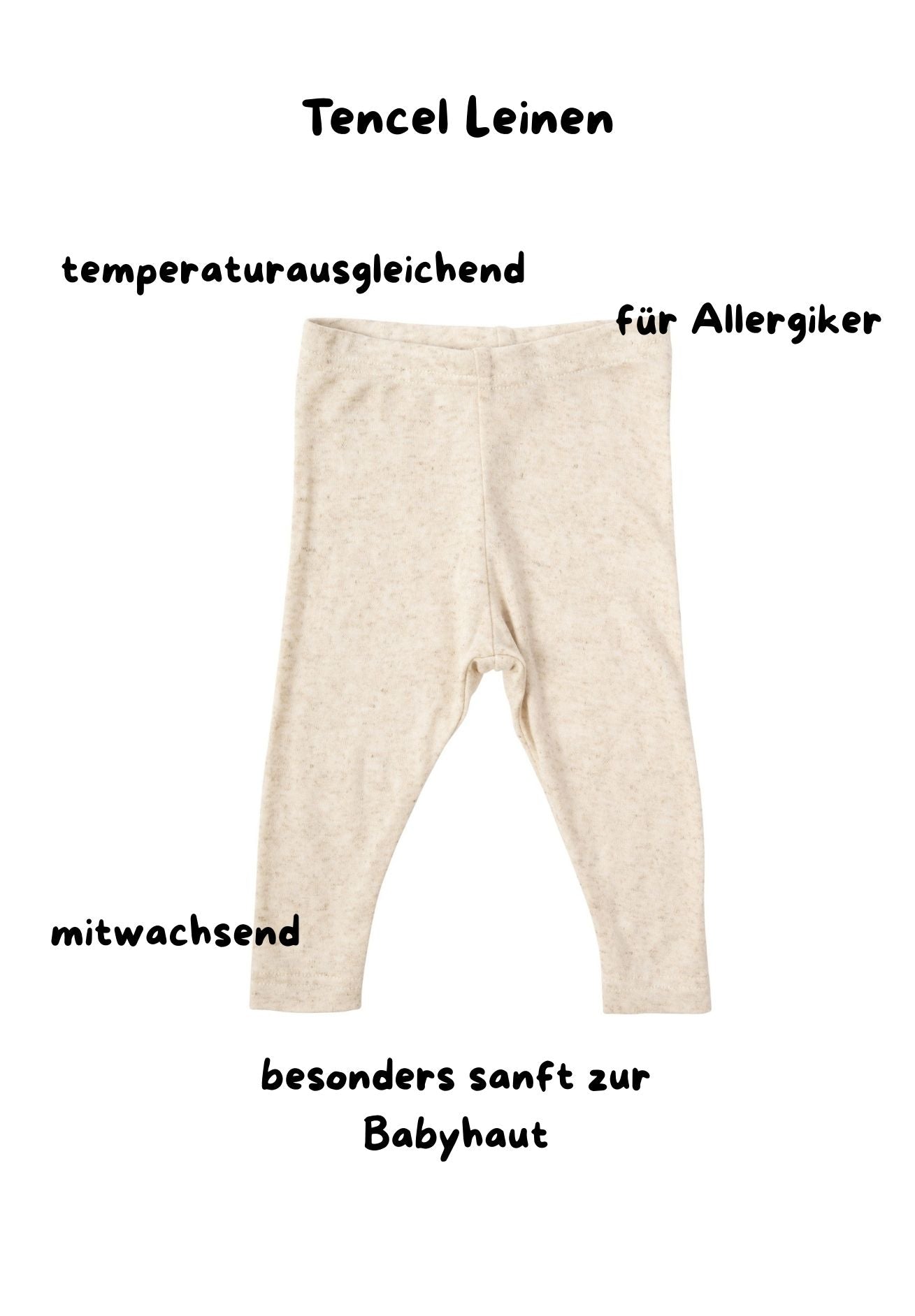 Zart zur Babyhaut, durchdacht für den Alltag: Unsere Leggings aus hochwertiger Tencel-Leinen-Mischung vereint natürliche Materialien mit außergewöhnlichem Tragekomfort. Der Stoff fühlt sich seidig weich auf der Haut an, ist besonders atmungsaktiv und unterstützt ein angenehmes Hautklima – ideal für empfindliche Babyhaut. Besonders auch für Allergiker geeignet.
